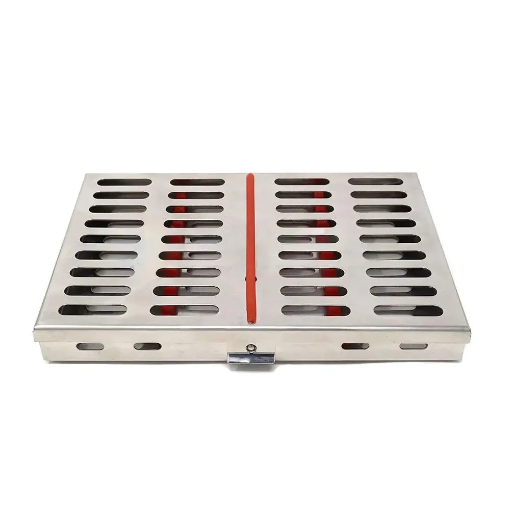 GDC Cassette For 10 Instruments (IMSCA10) is designed to ensure safe handling of surgical tools during cleaning and sterilization, helping reduce the risk of accidental injuries in clinical settings. Its secure locking mechanism keeps the tray firmly closed, protecting instruments throughout the entire sterilization cycle.