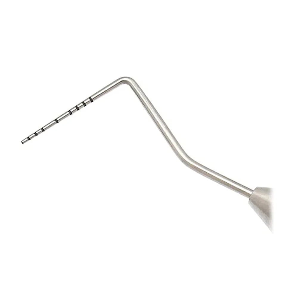 One end features a Thin William probe, designed for gentle insertion into the gingival sulcus and periodontal pockets. This end provides precise pocket depth measurements and helps evaluate gum health during routine and advanced periodontal examinations.