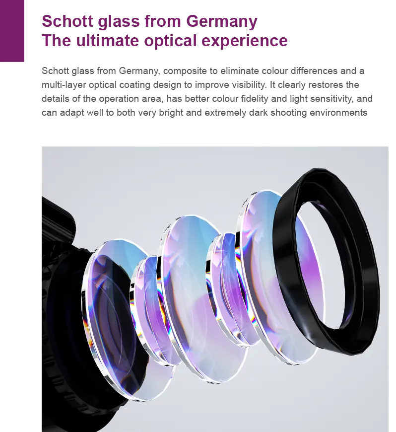 - Optics: Features German Schott glass with a multilayer coating to eliminate color differences and provide high resolution.